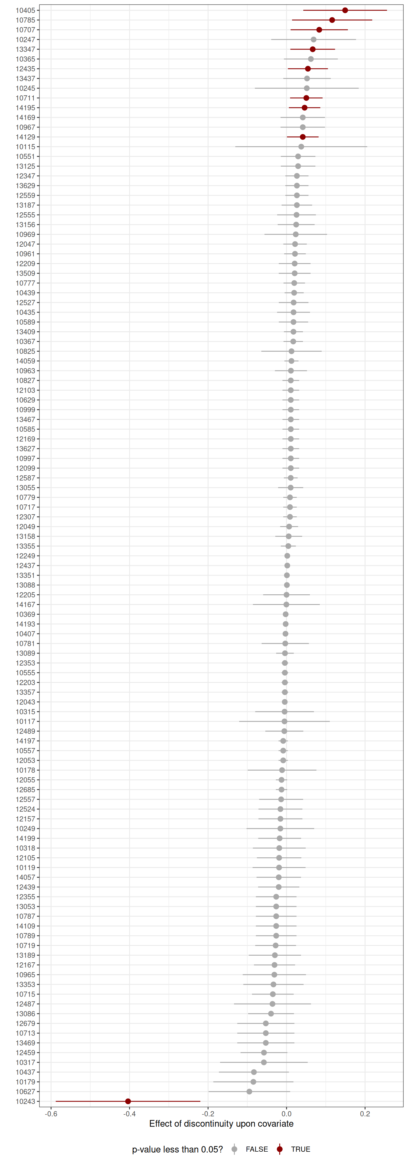 # Define a helper functiontidy_rd <-function(model, se_nr) { est <- model$coef[se_nr] se <- model$se[se_nr] low <- model$ci[se_nr, 1] high <- model$ci[se_nr, 2] zstat <- model$z[se_nr] pval <- model$pv[se_nr] h_left <- model$bws[1, 1] h_right <- model$bws[1, 2] b_left <- model$bws[2, 1] b_right <- model$bws[2, 2] p <- model$p n <-sum(model$N_h) smry <-tibble(estimate = est, std.error = se, statistic = zstat,p.value = pval, conf.low = low, conf.high = high, p = p,n = n, bw_left_h = h_left, bw_right_h = h_right, bw_left_b = b_left,bw_right_b = b_right )return(smry)}# Define covariatesoutcomes <-unique(dat$post_code)res <-lapply(outcomes, function(o) { x <- dat |>pull(years_rel_2013) y <-as.numeric(dat$post_code == o) rd <-rdrobust(y = y, x = x, c =0, h =5, b =5)tidy_rd(rd, 3) |>mutate(outcome = o)})res <-bind_rows(res)res <- res |>arrange(estimate) |>mutate(outcome =fct_inorder(outcome))ggplot(res, aes(x = outcome, y = estimate,ymax = conf.low,ymin = conf.high,colour = p.value < .05)) +scale_y_continuous("Effect of discontinuity upon covariate") +scale_x_discrete("") +geom_pointrange() +scale_colour_manual("p-value less than 0.05?",values =c("darkgrey", "darkred")) +coord_flip() +theme_bw() +theme(legend.position ="bottom") res <- res |>mutate(p.adj =p.adjust(p.value, "holm"))