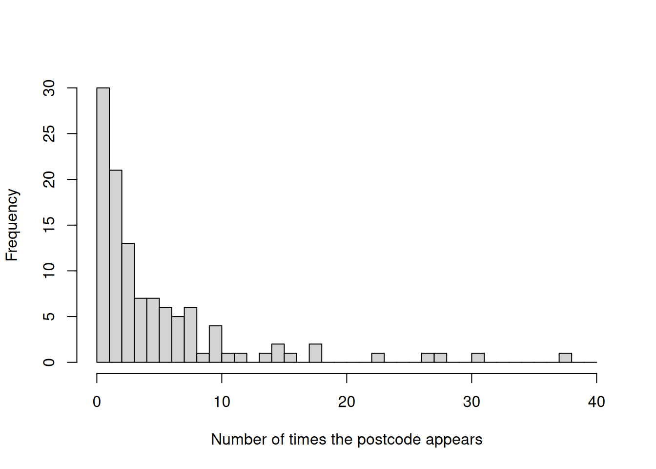 hist(table(dat$post_code),breaks =0:40,main ="",xlab ="Number of times the postcode appears")