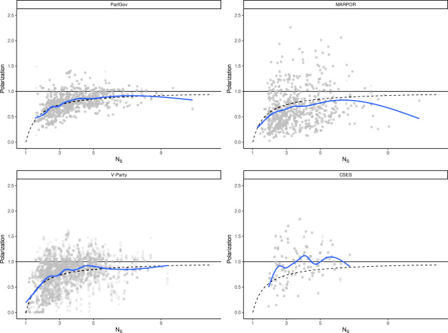 Polarization is a key characteristic of party systems, but scholars disagree about how polarization relates to the number of parties in a system. Different authors find positive, negative, or null relationships. I claim that when polarization is measured using the weighted standard deviation of standardized party positions, seat-level polarization is equal to \(\frac{N_S - 1}{\frac{1}{\sqrt{2}} + N_S - 1}\), where \(N_S\) is the effective number of seat-winning parties. This relationship is what one would expect if parties were drawn randomly from a super-population with an effective sample size somewhere between the effective and raw number of parties. I test this claim using multiple datasets which report party positions and seat shares, before extending my analysis to consider vote-level polarization, the range of positions, and polarization in presidential and parliamentary regimes. My work extends the Taageperaan research agenda of building interlocking networks of equations relating key quantities of electoral and party systems.